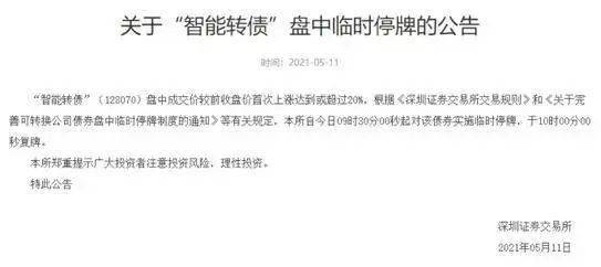 很快,深交所再次发布公告,“智能转债”(128070)盘中成交价较前收盘价首次上涨达到或超过30%,根据有关规定,深交所自10时00分00秒起对该债券实施临时停牌,于14时57分00秒复牌。