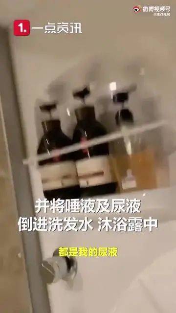 另一个视频片段显示,该男子对着卫生间的沐浴露瓶子说:" 兄弟们,这里面包含着我的尿液,待会儿那些人直接用了 "。 还有一个视频显示,该男子拿出一个沐浴露瓶子并打开瓶盖,直接往沐浴露内吐口水,吐了之后称," 让下面的人来用。"