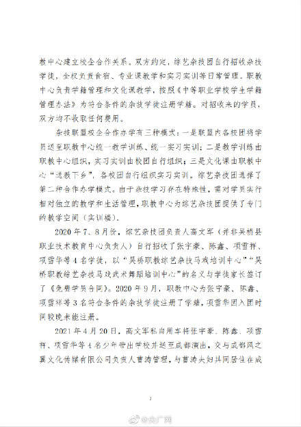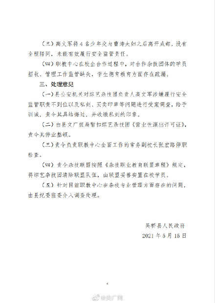 【官方通报杂技少年成都失联事件:责令涉事综艺杂技团停业整顿】16日,河北沧州市吴桥县人民政府发布关于“杂技少年成都失联事件”调查处理情况的通报:①对综艺杂技团负责人高文军涉嫌履行安全监管职责不到位以及私刻、买卖印章等问题进行受案调查,给予训诫,责令其具结悔过,并收缴私刻的印章。②由县文广旅局暂扣综艺杂技团《营业性演出许可证》,责令其停业整顿。③责令负责职教中心全面工作的常务副校长张宏路停职检查。④责令杂技联盟按照《杂技职业教育联盟章程》规定,将综艺杂技团清除联盟队伍,由联盟妥善安置在校学员。详情,戳图此前报道:河北吴桥职教中心回应“杂技少年集体出走”:对学生外地演出不知情(总台央广记者管昕)