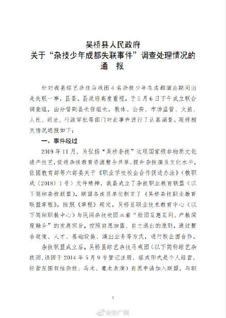 | 官方通报杂技少年成都失联事件:责令涉事综艺杂技团停业整顿 | |||