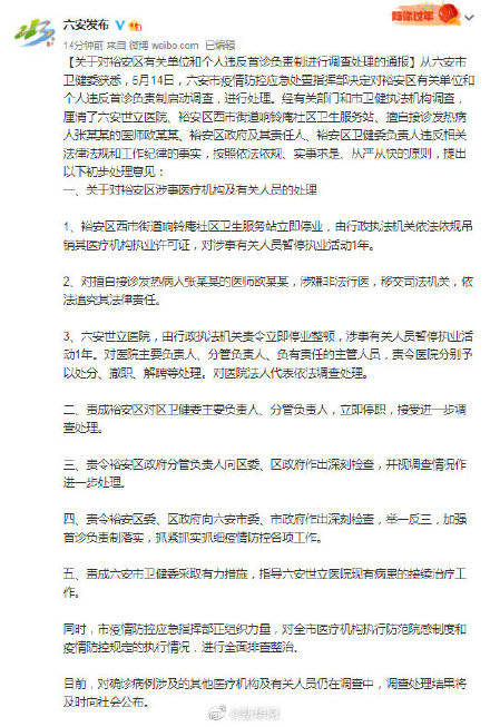 六安两家医疗机构因违法违纪停业【安徽六安疫情问责:两家医疗机构停业,区卫健委负责人停职】5月14日,安徽六安市疫情防控应急处置指挥部决定对裕安区有关单位和个人违反首诊负责制启动调查,进行处理。经有关部门和市卫健执法机构调查,厘清了六安世立医院、裕安区西市街道响铃庵社区卫生服务站、擅自接诊发热病人张某某的医师欧某某、裕安区政府及其责任人、裕安区卫健委负责人违反相关法律法规和工作纪律的事实,按照依法依规、实事求是、从严从快的原则,提出以下初步处理意见@六安发布