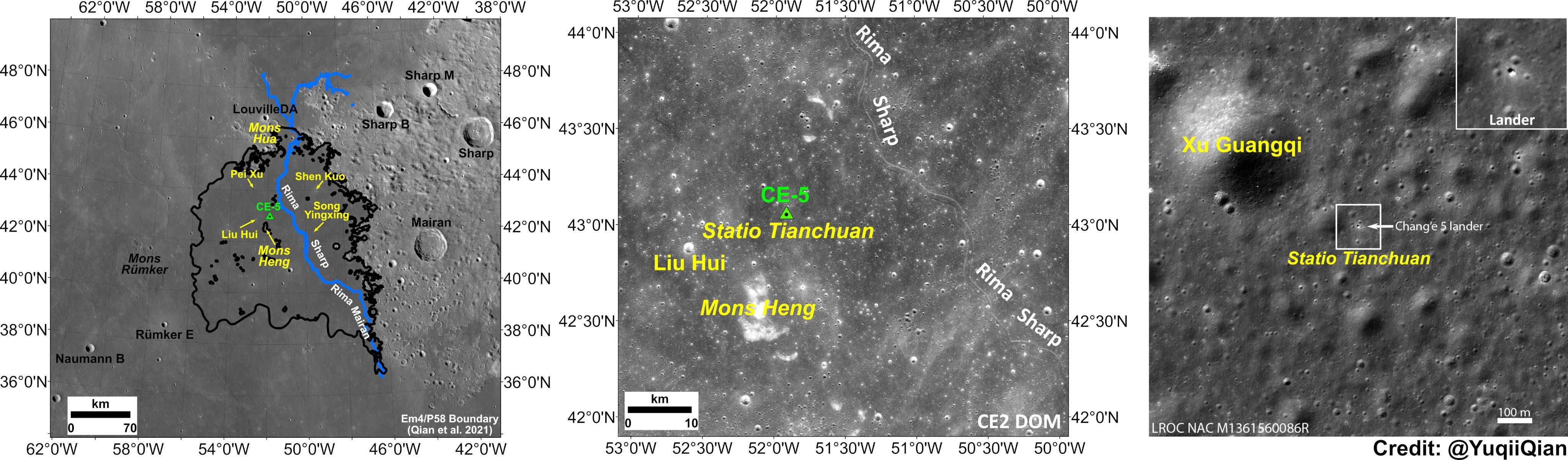 观察者网从国际天文学联合会(IAU)处获悉,嫦娥五号着陆区域8个地名已于5月19日获批,月球上又多了8个中国地名。经IAU批准,嫦娥五号着陆点命名为天船基地;着陆点附近5个环形坑命名为裴秀、沈括、刘徽、宋应星和徐光启;着陆点附近两座山脉分别命名为华山和衡山。 相关结果已经在国际天文学联合会行星系统命名工作组的公开资料库中更新。