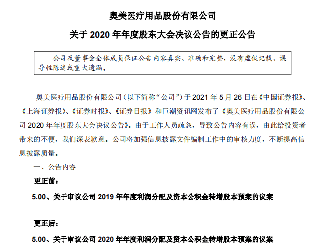 图片来源:监管函截图 全文如下: 杜先举: 你的子女杜开文于2020年7月6日至8月5日期间存在频繁买卖公司股票的行为,累计买入公司股票54100股,交易金额165.65万元;累计卖出公司股票54,100股,交易金额162.08万元。前述行为构成《证券法》第四十四条规定的短线交易。 你作为公司董事、高级管理人员,未能督促你的子女合规交易公司股票,违反了本所《股票上市规则(2018年11月修订)》第1.4条和《上市公司规范运作指引(2020年修订)》第3.8.1条、第3.8.13条的规定。请你充分重视上述问题,吸取教训,及时整改,杜绝上述问题的再次发生。 同时,提醒你:上市公司董事、监事、高级管理人员及其配偶、父母、子女买卖本公司股票,应当严格遵守国家法律、法规、本所《股票上市规则》和《上市公司规范运作指引》等规定,并认真、及时地履行信息披露义务。 特此函告 深圳证券交易所上市公司管理一部 2021年5月29日 数据显示,截至2021年3月31日,奥美医疗股东总人数(户)为5.58万户,较上期减少2.49%。 上述监管函一出,股吧马上炸了锅。 有网友表示: “赔三万,高手” “一顿操作猛如虎,一看盈利是负数……还把爹坑了” “这是帮自家砸盘吗” “笑死了,自家买自家的都亏了” 有意思的是,5月26日,奥美医疗发布了《奥美医疗用品股份有限公司2020年年度股东大会决议公告》,把《关于审议公司2020年年度利润分配及资本公积金转增股本预案的议案》中的“2020年”,错写成“2019年”,玩起了穿越。 随后,公司又发布了一则《更正公告》。