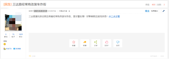 据广东省佛山市公安局三水分局微信公众号“三水公安”4月29日消息,近日,三水交警接到热心网友举报,网民发帖称三达路蒲坑农庄附近,晚上经常有改装车炸街,严重影响附近居民休息。