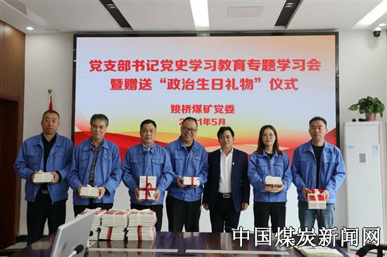 【本网讯】5月4日,中煤大屯公司姚桥煤矿召开党支部书记党史学习教育专题学习会暨赠送“政治生日”礼物仪式。该矿党委副书记、纪委书记许自豪出席学习会,地面机关科室、辅助单位及一线区队党支部书记参加学习会。