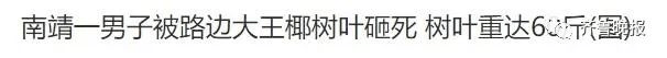 很多北方网友表示:惊到了 “树叶中的王者“ @银龙鱼调和油:这个树叶跟我认知里的树叶不是一个东西 @水猴子:我还在心想树叶也能砸伤人?点进去一看,妈耶,比人还大的树叶! @总是迟到的火枪手:看标题树叶都能砸倒人?点开一看这是树叶里的王者啊! 附近的居民称, 这里的大王椰树叶掉落时有发生, 已经掉过三次了。 其实,全国多地都出现过 “大王椰树叶砸到人”的新闻