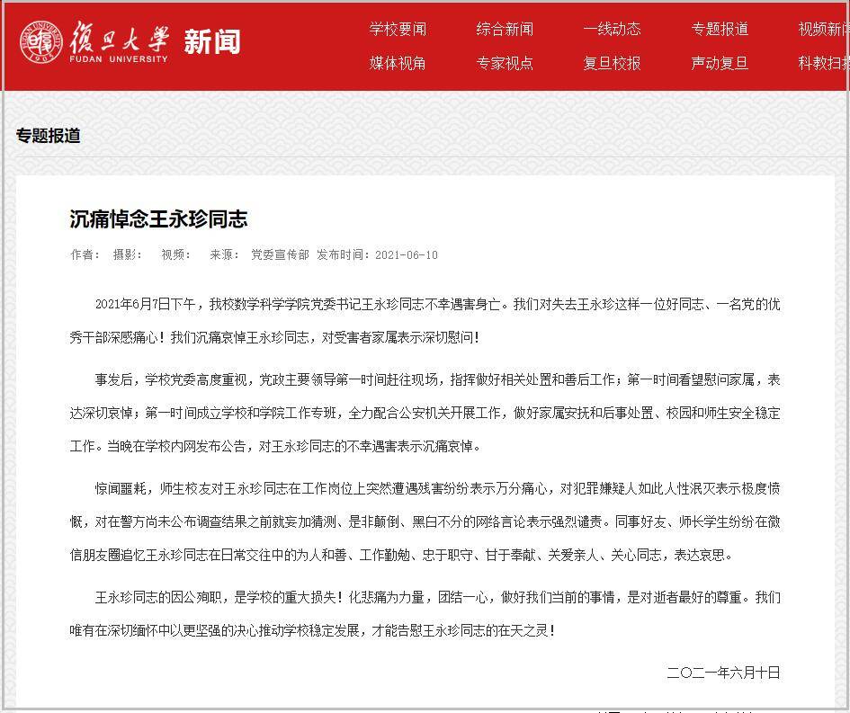 6月10日,复旦大学在其官网发文,沉痛悼念不幸遇害身亡的该校数学科学学院党委书记王永珍,全文如下: 2021年6月7日下午,我校数学科学学院党委书记王永珍同志不幸遇害身亡。我们对失去王永珍这样一位好同志、一名党的优秀干部深感痛心!我们沉痛哀悼王永珍同志,对受害者家属表示深切慰问! 事发后,学校党委高度重视,党政主要领导第一时间赶往现场,指挥做好相关处置和善后工作;第一时间看望慰问家属,表达深切哀悼;第一时间成立学校和学院工作专班,全力配合公安机关开展工作,做好家属安抚和后事处置、校园和师生安全稳定工作。当晚在学校内网发布公告,对王永珍同志的不幸遇害表示沉痛哀悼。 惊闻噩耗,师生校友对王永珍同志在工作岗位上突然遭遇残害纷纷表示万分痛心,对犯罪嫌疑人如此人性泯灭表示极度愤慨,对在警方尚未公布调查结果之前就妄加猜测、是非颠倒、黑白不分的网络言论表示强烈谴责。同事好友、师长学生纷纷在微信朋友圈追忆王永珍同志在日常交往中的为人和善、工作勤勉、忠于职守、甘于奉献、关爱亲人、关心同志,表达哀思。 王永珍同志的因公殉职,是学校的重大损失!化悲痛为力量,团结一心,做好我们当前的事情,是对逝者最好的尊重。我们唯有在深切缅怀中以更坚强的决心推动学校稳定发展,才能告慰王永珍同志的在天之灵!
