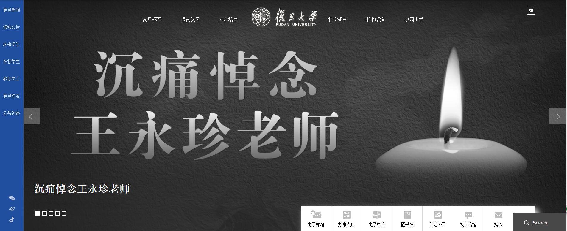 本周一(7日),上海市公安局文化保卫分局发布警情通报称,当天14时52分,上海市杨浦区邯郸路某大学发生一起持刀伤人案件。民警迅速到场将犯罪嫌疑人姜某(男,39岁,该校教师)控制,经120现场确认,被害人王某(男,49岁,系姜某同事)已死亡。经初步审讯,姜某自述因工作关系对被害人怀恨在心,故对其实施侵害。现姜某已被依法刑事拘留,案件正在进一步侦办中。 6月8日,复旦大学数学科学学院发布讣告,证实其党委书记王永珍不幸遇害身亡。“忆及往事,历历在目,哀思之情,难以言表。王永珍同志的逝世是我院的重大损失,全院师生无比悲痛,沉痛哀悼并深切缅怀我们勤勉敬业、和蔼可亲的王书记!” 目前,复旦大学已将其官网首页轮播图更换为“沉痛悼念王永珍老师”。同时,除了复旦大学党委宣传部的悼念文外,点击专题还有包括王永珍曾经的老师,以及同事等在内写下的多篇悼文。