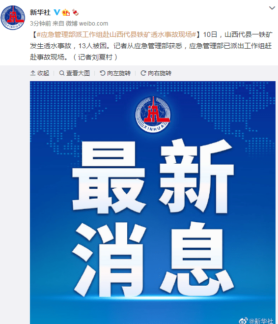 6月10日,山西代县一铁矿发生透水事故,13人被困。记者从应急管理部获悉,应急管理部已派出工作组赶赴事故现场。