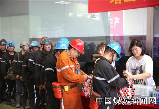 在井口大厅,该矿领导和女工家属协管员们把香喷喷的粽子,实用的毛巾、牙膏、香皂,充满祝福的平安结等节日慰问品送到出入井的一线职工手中,并不停地叮嘱他们在工作中要注意安全,按章作业,别让家里人挂念,一个个香甜的粽子、一句句暖心的祝福,让温馨、关爱、祝福溢满整个井口大厅。图为活动现场女工协管员等为矿工送去粽子。