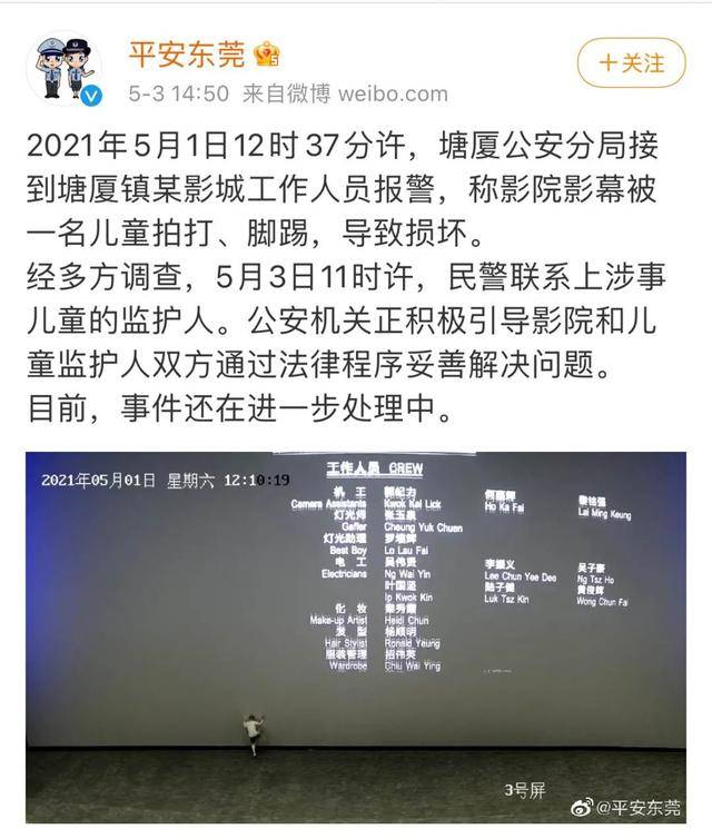 平安东莞微博。图片来自网络 5月29日晚,洛阳一男孩在洛阳格调电影工厂影院七号厅观影中途走到银幕前,持续拍打按压银幕,使银幕受损。6月2日,影院要求孩子家长赔付1.5万元,家长以:“影院未提醒顾客银幕不可触摸及拍打,孩子身心受到了影响”为由,拒绝赔偿。双方协商不成,决定走法律途径解决。 新京报记者近日电话联系到了洛阳格调电影工厂影院的经理袁鹏,他表示:“目前已经走诉讼程序,不方便接受采访”。一块银幕索赔1.5万元,到底贵不贵?孩子损坏银幕,责任在谁?如何避免影院硬件设备受损?带着这几个问题,新京报记者又采访了多位北京影院经理和业内人士,聊了聊银幕的价格和维护,并共同探讨了如何让观众文明观影。 事件回放: