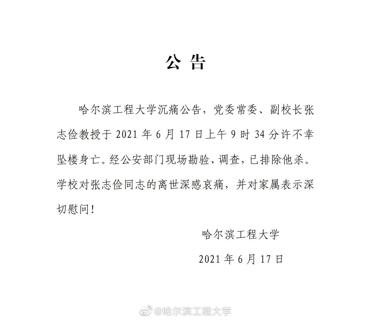 哈尔滨工程大学副校长张志俭昨日坠楼身亡,已排除他杀