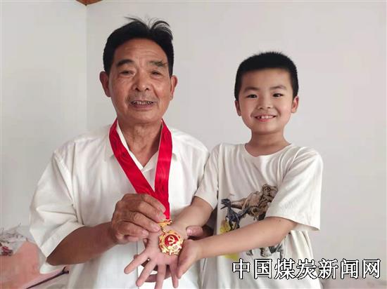 【本网讯】6月26日,山东济宁能源发展集团运河煤矿入户走访慰问部分老党员、困难党员,为他们送去节日的祝福,带去组织的关怀,并为他们颁发了“光荣在党50年”纪念章。图为爷孙两人手捧纪念章,分享喜悦。