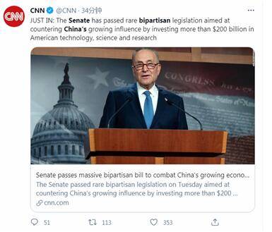 | 鼓噪对华搞全面战略竞争!美参议院通过法案,投资2000亿美元“应对中国” | |||