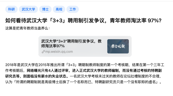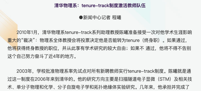 • 清华大学从 2003 年起开始推行 Tenure-track 不同大学各有差异,但流程大抵相似。新入职的教师获得的是「预聘」岗位,期限一般为三年,最多只能续约一次。在预聘期间,教师需要完成数量明确、可量化的绩效目标——比如发表三篇 SCI 一区论文、主持一项国家自然基金重大项目。完成之后,再竞争上岗。如果在两个聘期内没有完成竞升,则自动解除聘用关系。 对于学校而言,「预聘」教师相当划算,他们年轻,学术生命旺盛,为了完成 KPI 而拼命工作,最重要的是,可以随便甩掉而不负责任。 或许因为过于划算,高校许多高校想出了各类名头来招聘这些教师,如师资博士后、准聘副教授、聘期制讲师、特聘副研究员等等,都属于此一类型。 这些岗位都是校设岗位,只要学校的一纸文件就可以溯及既往的改变自己曾经的承诺或解除合同。 2018 年,武汉大学就被爆出有97%的特聘副研究员没有通过学校审核,引起网络热议。