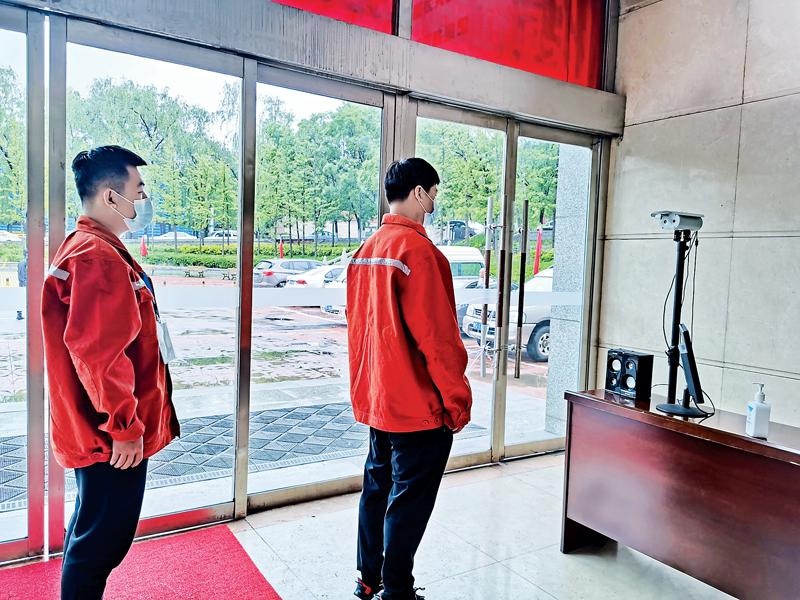 参赛选手入场前排队测量体温。