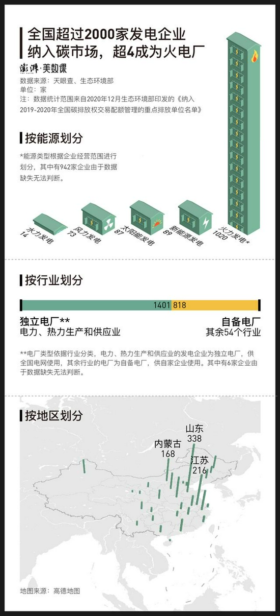 根据每日经济新闻报道,2021年7月16日,全国碳排放交易市场(以下简称“碳市场”)正式启动。在启动仪式上,生态环境部部长黄润秋表示,全国碳市场第一个产业周期,我国发电行业重点开放单位共计2162家,覆盖二氧化碳排放量约为45亿吨。 这一切,都是为了中国2060年的碳中和目标。北京环境交易所总经理梅德文在“发展绿色金融高效助力‘碳中和’”线上研讨会上提出,如果把碳市场做大做强,我国可以最低成本,最高效率地实现碳达峰和碳中和。 首批进入全国碳市场的电厂,近半是火电 全国碳市场将会以发电行业为突破口。为了一览获得首批入场券的电厂概况,澎湃新闻记者(www.thepaper.cn)梳理了生态环境部此前公布的2225家首批重点排放单位的基本信息,与最新情况可能存在微量差距。 根据之前的名单,它们主要集中在山东、江苏、内蒙古等中东部省份,涵盖了发展火电、水电、风电、太阳能(6.760, 0.33, 5.13%)等项目的发电企业。