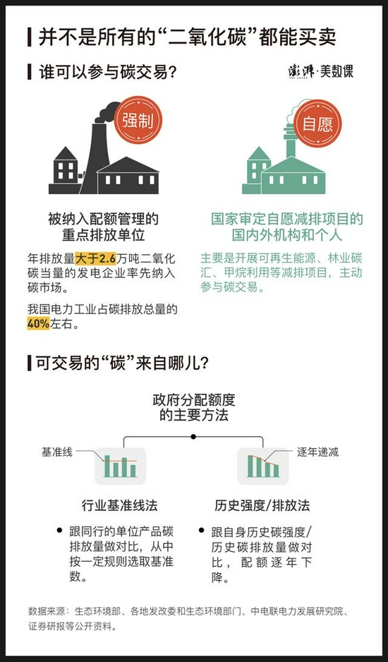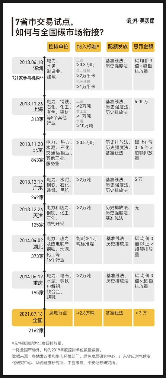 参与碳市场的企业一般分为两种:强制参与的重点排放单位和自愿参与的减排机构。它们各自可用于交易的“碳”分别是碳配额和碳减排量。重点排放单位的碳配额,也就是碳排放权,需要政府强制限定。政府会根据企业的行业性质、业务内容和实际情况采用不同的分配方法。目前主流的配额分配方法有行业基准线、历史强度法和历史排放法。三种方法之间各有千秋。历史法考虑企业自身情况,计算相对简单,但容易造成“鞭打快牛”的现象。行业基准线法就更能激励企业采取减排行动,但对行业各方面数据要求比较高。 而自愿减排单位则是主动通过新能源、碳汇等方式进行减排,经过国家审核批准后,可以在碳市场中出售其碳减排量,供实际排放量超出碳配额的企业购买。 其实在全国碳市场上线之前,我们就有着丰富的碳交易探索经验。2005年,欧洲碳市场启动,我国的自愿减排企业就通过清洁发展机制主动参与到国际碳交易当中。2011年,我国正式批准在北京、天津、上海、重庆、湖北、广东、深圳启动7个碳交易试点,开始为全国碳市场做准备。