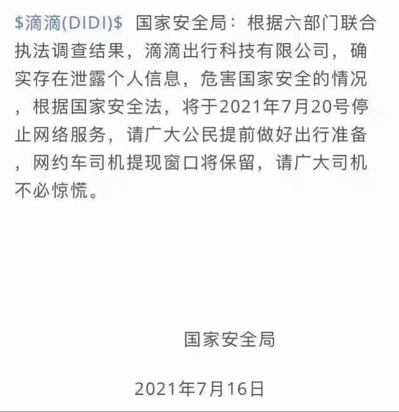 7月17日,一则“滴滴出行将停止网络服务”的消息在网上流传。该署名为“国家安全局”发布的消息称:经调查,滴滴出行存在泄漏个人信息、危害国家安全的情况,将于2021年7月20日停止网络服务,请公众提前做好准备,司机提现窗口将保留。