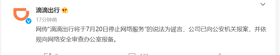 | 滴滴出行7月20日将停止服务?公司回应:谣言,已报案 | |||