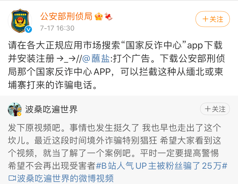 该博主在微博中配上其报警的图片 微博@波桑吃遍世界 图 17日下午,澎湃新闻注意到,公安部刑事侦查局官方微博@公安部刑侦局也发转发@波桑吃遍世界的自述视频,并配文称“请在各大正规应用市场搜索‘国家反诈中心’app下载并安装注册。”