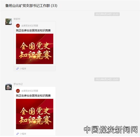 在矿党委的组织下,该矿党员、职工积极响应、热情参与,通过“全国党史知识竞赛”小程序进行竞赛答题,并时常交流答题心得,分享答题技巧,共享答题经验,学习党史知识的积极性空前高涨,形成了学赛结合的浓厚氛围。