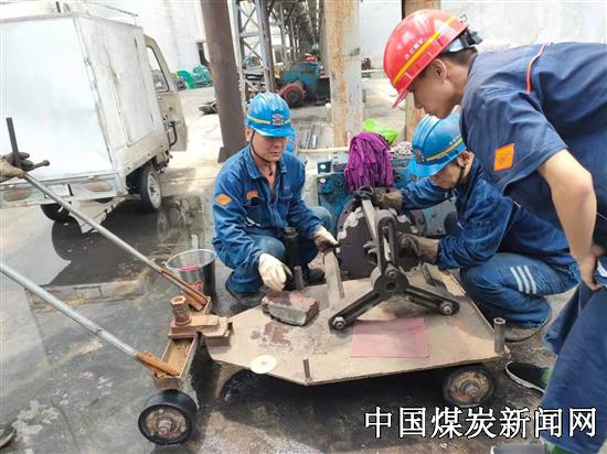 该中心认真吸取公司兄弟单位事故教训,开展胶带输送机专项整治活动,强化胶带机现场管理工作力度,针对胶带输送机机架、溜槽、挡煤板、托辊、各类保护进行统一规范,对胶带运行过程中出现的跑偏、撒煤等问题进行集中整改,提高了胶带输送机的运行质量和寿命;对皮带加装烟雾报警及超温自动洒水,为胶带机安全稳定运行保驾护航,同时抓好胶带机日常巡检维护工作,杜绝出现积煤磨托辊、滚筒及胶带的情况发生,保了胶带机的运行使用安全;不断规范现场机电管理,对原煤系统的防爆电器设备及防护设施进行了统一整治,按照“定时、定质、定量”的原则统一制定了设备润滑标准,并以牌板的形式悬挂到机电修班组,有效确保润滑质量;扎实做好设备基础除锈防腐工作,按照计划,逐步组织人员对现场出现锈蚀现象的设备基础、机架、护栏及护网等进行加固、除锈、防腐刷漆等工作,大大提高了现场机械设备的使用寿命,有效确保设备安全、健康、高效运行。图为职工对设备进行维修和除锈防腐。