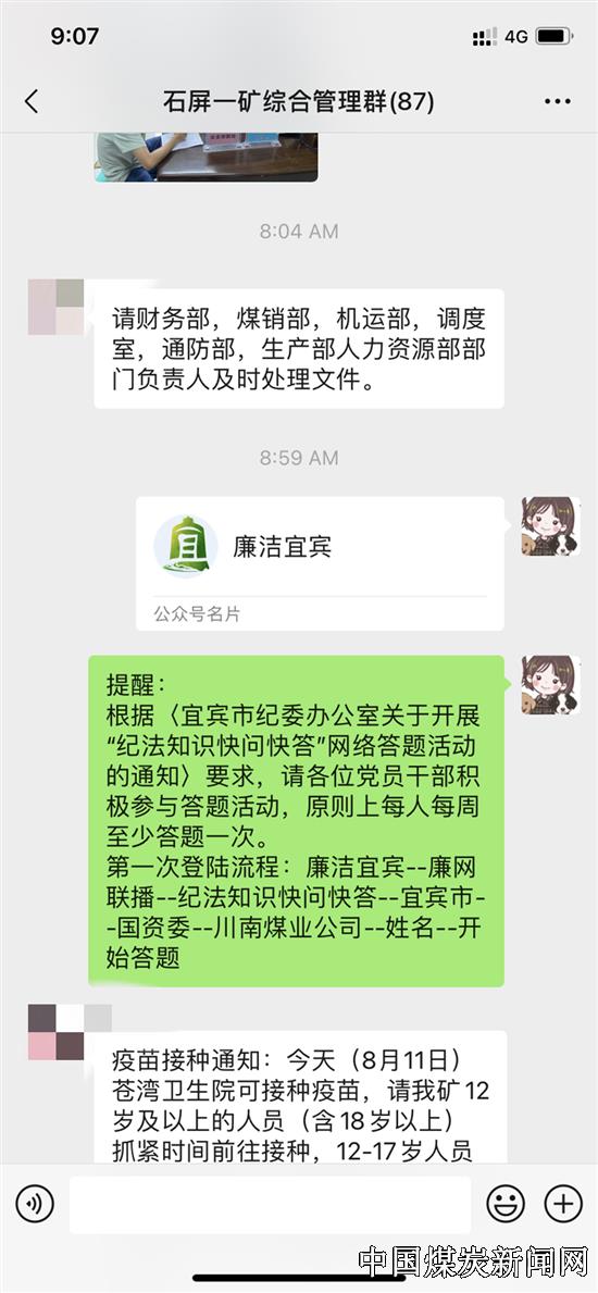 【本网讯】为进一步促进公司党员干部掌握应知应会纪法条例,切实让广大党员干部做到知纪知法、学纪学法、守纪守法,增强守纪法、做表率的思想和行动自觉,根据《中共宜宾市纪委办公室关于开展“纪法知识快问快答”网络答题活动的通知》要求,古叙煤田公司石屏一矿纪委积极组织开展“纪法知识快问快答”答题活动。![]() 矿纪委一是转发答题要求与操作流程图到各个群提醒各党员干部积极参与;二是利用党支部书记例会进一步传达答题通知与要求;三是组织志愿者到基层加强答题活动的宣传与操作示范,把答题活动的通知要求落实到每一位党员干部。 ![]()