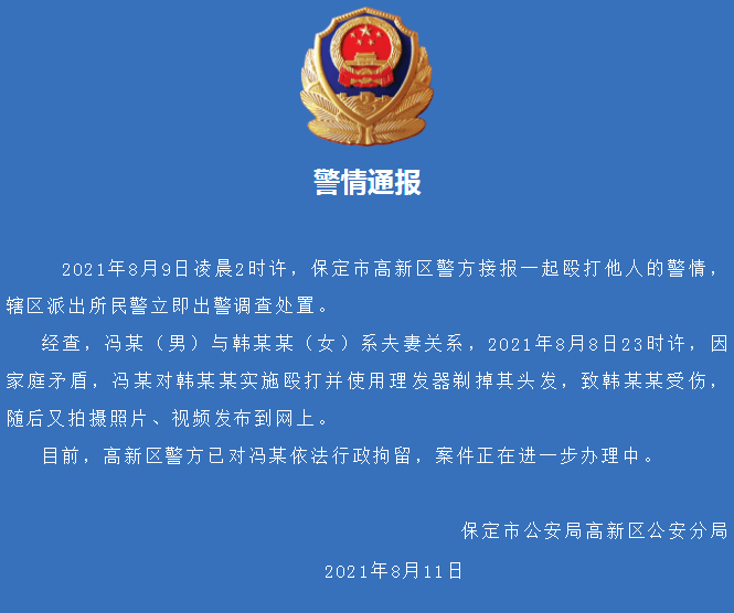 保定市公安局高新区分局8月11日发布警情通报称,2021年8月9日凌晨2时许,保定市高新区警方接报一起殴打他人的警情,辖区派出所民警立即出警调查处置。 经查,冯某(男)与韩某某(女)系夫妻关系,2021年8月8日23时许,因家庭矛盾,冯某对韩某某实施殴打并使用理发器剃掉其头发,致韩某某受伤,随后又拍摄照片、视频发布到网上。 目前,高新区警方已对冯某依法行政拘留,案件正在进一步办理中。