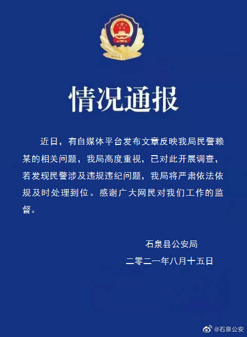 近日,有网传消息称,“陕西石泉县公安局一赖姓民警在某律师群里透漏公民个人信息,给律师支招对付公安机关和警察”。8月15日,陕西省安康市石泉县公安局官方微博@石泉公安 发布情况通报称,近日,有自媒体平台发布文章反映民警赖某的相关问题,公安局高度重视,已对此开展调查,若发现民警涉及违规违纪问题,公安局将严肃依法依规及时处理到位。