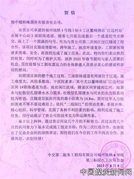 | 中煤矿建特凿公司市政工程事业部福州地铁4号线3标9工区联络通道项目部喜获甲方贺信 | |||