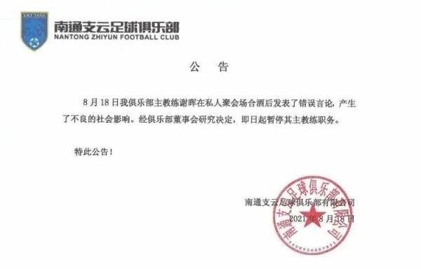 微博中,谢晖提及自己喝了很多酒“不知道对面的人别有用心,进行了偷拍,把一些我酒醉的话发到了网上。并且添油加醋。严重损害了我的名誉。对此类人渣深恶痛绝,本人保留法律诉讼的权利!” 声明最后,谢晖还向视频中提及的成都蓉城、上海申花、上海上港、南通支云等单位表示了深切的道歉。 公开信息显示,谢晖2020年初担任南通支云俱乐部主教练,至今执教了一个半赛季。上赛季,南通支云排名中甲联赛中游。今年南通支云成绩曾一度排进前四。在第一阶段18轮比赛后,暂时排在第7名,离升级附加赛区有6分的差距。