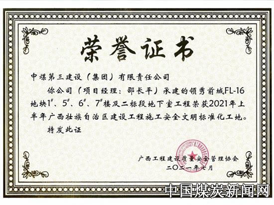 【本网讯】近日,中煤矿建特凿公司南宁项目部再传捷报,其承建的保利·领秀前城FL-16地块1#、5#、6#、7#楼及二标段地下室工程获评“2021年上半年广西壮族自治区建设工程施工安全文明标准化工地”荣誉称号!