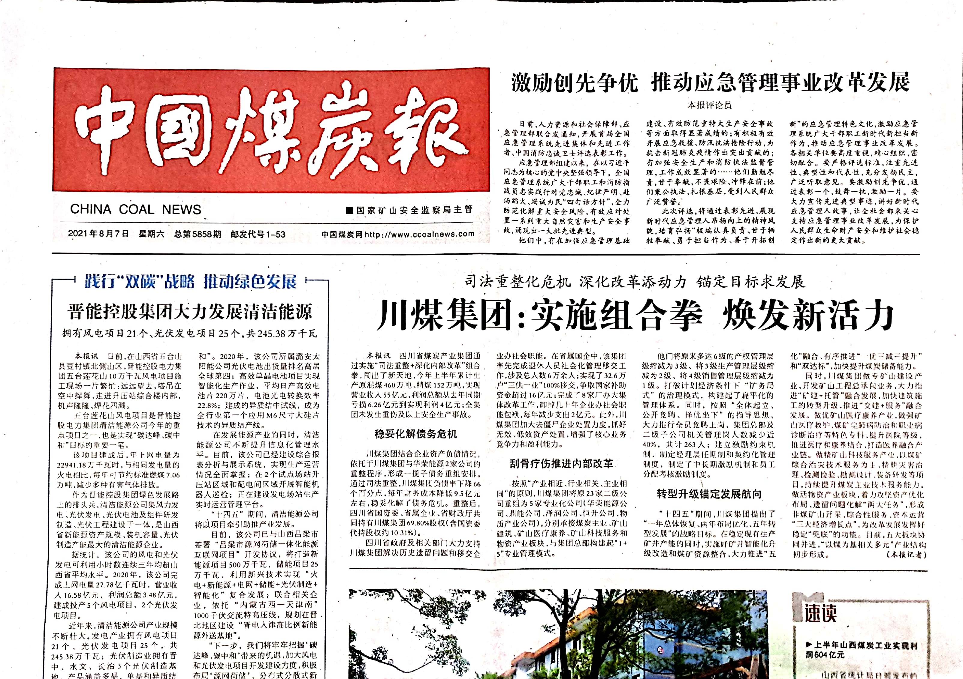 ![]() 川观新闻记者8月10日从四川省煤炭产业集团有限责任公司(简称“川煤集团”)获悉,通过司法重整和深化内部改革,该公司实现经营指标扭亏为盈。截至7月底,川煤集团资产总额为291亿元,1-7月累计生产原混煤535.3万吨、精煤177.5万吨,实现营业收入69.4亿元,利润总额从去年同期亏损6亿元到盈利4.5亿元。 去年6月,川煤集团正式启动并实施司法重整。一年时间过去,目前已完成30万元以下现金清偿和以股抵债股东工商变更,重整计划执行顺利推进。通过司法重整,川煤集团负债率下降66个百分点,每年财务成本降低9.5亿元左右,稳妥化解了债务危机。重整后,省国资委、省属企业、省财政厅共同持有川煤集团69.80%股权(含国资委代持股权约10.31%)。 化解债务危机之后,如何增强企业“造血”能力,加快实现健康发展?川煤集团通过系列举措深化内部改革,推进转型升级。 推进资产重组。按照“产业相近、行业相关、主业相同”的原则,将原23家二级公司重组为5家专业化公司( 华荣能源公司、鼎能公司、泽润公司、恒升公司、物质产业公司),分别承接煤炭主业、矿山建筑、矿山医疗康养、矿山科技服务和物资产业板块,与集团总部构建起“1+5”专业管理模式。 精简管理层级。将原来多达6级的产权管理层级缩减为3级、将3级生产管理层级缩减为2级、将4级销售管理层级缩减为1级。打破计划经济条件下“矿务局式”的治理模式,构建起扁平化的管理体系,推动公司决策流程更加顺畅科学,管理成本下降15个百分点。 激活管理机制。推行全员竞聘上岗,打破干部“内循环”和“近亲繁殖”现象,集团总部及二级子公司机关管理岗人数减少近40%,共计263人;建立激励约束机制,制定经理层任期制和契约化管理制度,制定了中长期激励机制和员工分配考核激励制度。 加快推进转型升级。做强煤炭核心主业,提升煤炭储备能力、市场调节能力和兜底全省能源保障能力;做专矿山建设产业,推进“矿建+托管”融合发展,加大建筑施工的转型升级;做优矿山医疗康养产业,打造医养融合产业链;做精矿山科技服务产业,以煤矿综合治灾技术服务为主,精耕灾害治理、检测检验、勘测设计、装备研发等项目,持续提升煤炭主业技术服务能力;做活物资产业板块,形成非煤矿山开采、综合性服务、资本运营三大经济增长点。