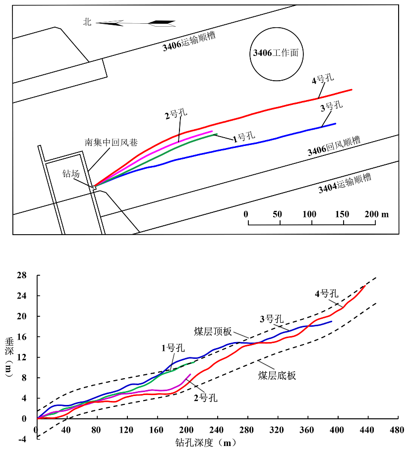 钻孔轨迹 中国煤科西安研究院得知情况后,直面技术挑战,于2021年4月专门成立了天地王坡煤矿钻探技术攻关专家组。在前期试验基础上,确定了“碎软煤层氮气排渣气动定向钻进技术”新方案。方案采用高压氮气(杜绝烧钻、CO超限风险)为动力源,驱动孔底气动螺杆钻具工作,带动钻头回转碎岩,同时氮气作为排渣介质携带钻进过程的热量,并将孔内产生煤渣沿钻具与孔壁之间环空间隙排出孔外。利用随钻测量系统监测钻孔轨迹变化,通过调节气动螺杆钻具弯角朝向调整钻孔轨迹按设计轨迹钻进。新方案成功解决了气源风压不足、喷孔卡钻、压风钻进粉尘治理、碎软煤层钻孔轨迹控制等技术难题。在王坡煤矿南翼施工顺煤层气动定向钻孔4个,最大单班进尺60m,累计进尺1530m,全煤钻孔最大深度达437m。 项目负责人介绍,“煤矿井下碎软煤层氮气排渣气动定向钻进技术与装备”项目研发的成功,解决了碎软煤层长距离精准定向成孔及开分支的技术难题,也解决了气动定向安全高效排渣、钻孔轨迹随钻测量、定向施工安全控制以及职业健康保障的难题。为国内其他碎软煤层矿区采用“跨工作面区域瓦斯递进式抽采新模式,保障安全高效生产、实现企业降本增效”提供了新的解决方案,降低了碎软煤层开采的风险和难度。 据悉,目前该成果已进入示范推广阶段。
