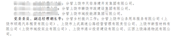上饶城投集团官网显示,胡长华分管乡村振兴工作;分管上饶市公务用车服务有限公司(上饶市顺通汽车租赁有限公司)、上饶市上武高速公路经营管理有限责任公司、上饶市新型材料有限公司(上饶市城投实业有限公司)、上饶市港口投资建设有限公司、江西上饶海港物流有限公司。 据官网介绍,上饶市城市建设投资开发集团有限公司(简称市城投集团公司)成立于2002年6月18日,是市政府所属的国有独资公司、市一类企业;主要职能是项目投融资、工程建设和完成市委、市政府交办的其他事项,经营范围包括:国有城建资产经营、基础设施项目建设、土地开发、房地产开发、房屋租赁、公路建设运营、公务用车服务及社会化运营、普通道路货物运输、物流服务、建材销售、餐饮服务,对医疗产业、养老产业、能源产业、电力产业、公共交通产业、水务产业、环保产业等投资。公司注册资本10亿元,企业信用评级为“AA+”,截止2020年12月底公司资产总额1050.72亿元,资产负债率为63.44%。 来源:正观新闻