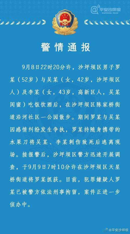 9月8日22时20分许,沙坪坝区男子罗某(52岁)与吴某(女,42岁,沙坪坝区人)及李某(女,43岁,高新区人,吴某闺蜜)吃饭饮酒后,在沙坪坝区陈家桥街道沿河社区一公园散步。期间罗某与吴某因感情纠纷发生争执,罗某持随身携带的水果刀将吴某、李某刺伤致死后逃离现场。 接报警后,沙坪坝区警方迅速开展调查,于9月9日7时10分许在沙坪坝区天星桥街道将罗某抓获。目前,犯罪嫌疑人罗某已被警方依法刑事拘留,案件正进一步侦办中。