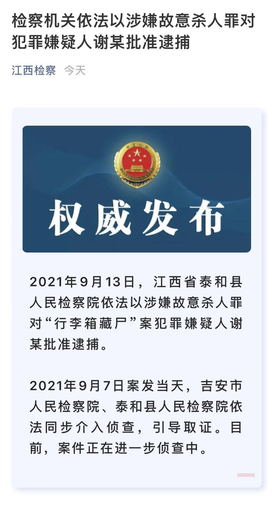 澎湃新闻记者 陈绪厚 实习生 张瑶 发生在江西吉安市泰和县城的“行李箱藏尸案”近日受到关注。 据江西省人民检察院微信公号9月13日消息,江西省泰和县人民检察院依法以涉嫌故意杀人罪对“行李箱藏尸”案犯罪嫌疑人谢某批准逮捕。