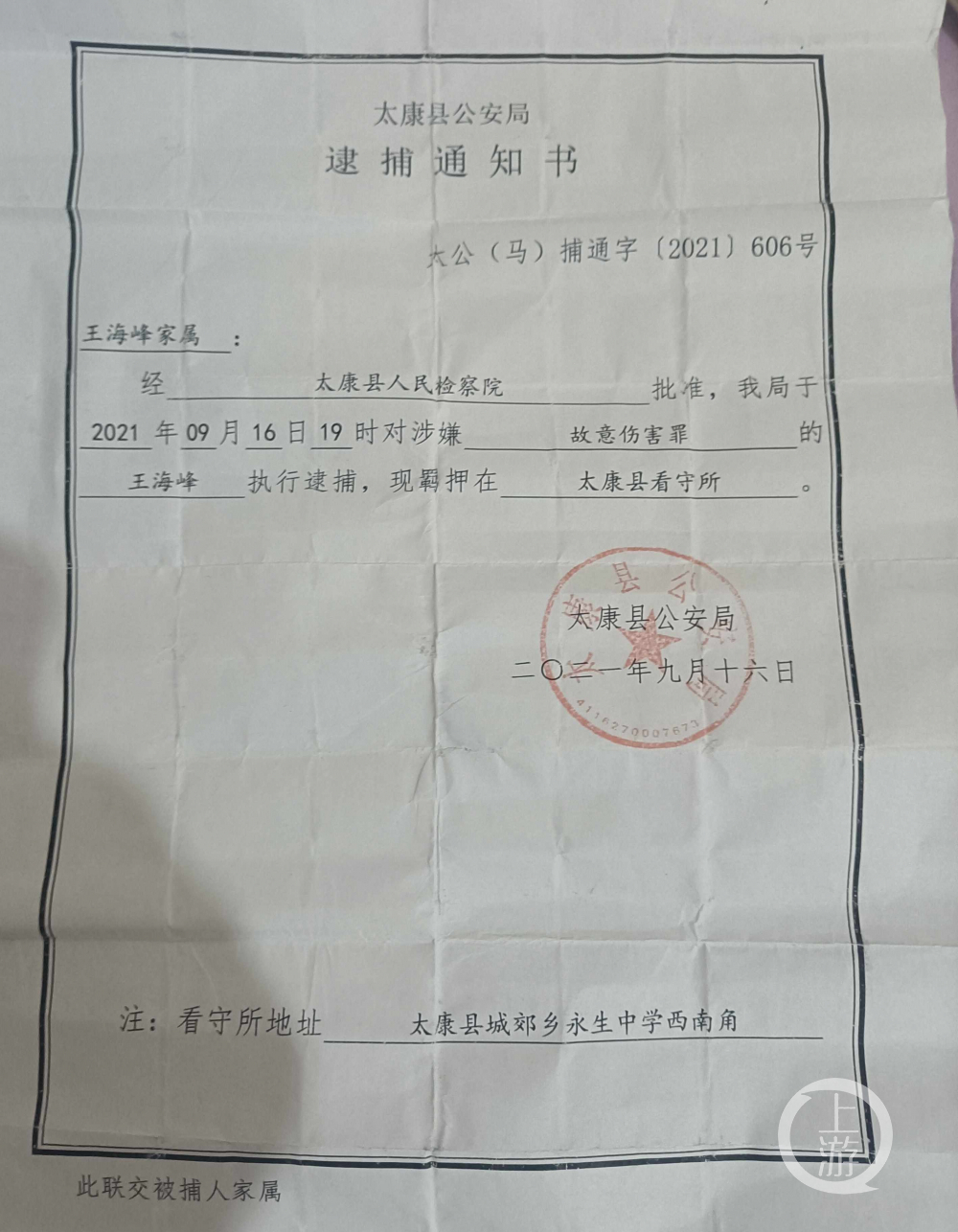 9月26日,河南省周口市太康县马头镇派出所内,杨庄小学校长王海峰的家属领到了逮捕通知书,叹气说:“太窝火了。” 上游新闻(报料邮箱:cnshangyou@163.com)记者从多方证实,6月21日下午5时许,醉汉彭建峰闯入杨庄小学校园,朝正在嬉戏的小学生爆了一句粗口,推搡着校长王海峰进入宿舍,动手打了王海峰。王海峰还手,致彭建峰倒在宿舍内。经鉴定,王海峰鼻骨骨折,彭建峰掉了三颗牙,两人均是轻伤二级。