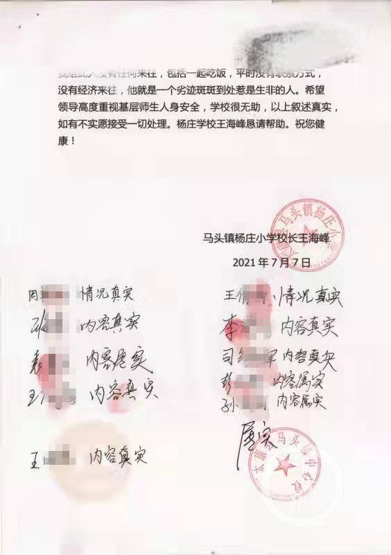 村民和学校为校长叫屈 王海峰被拘前写了一份《情况说明》,上面按有村民手印、盖有马头镇中心学校公章。 该说明显示,彭建峰是个有劣迹的人,王海峰之所以还手是怕彭建峰伤害到学生。 杨庄是自然村,隶属于刘庄村。刘庄村一名村干部称,村民之所以愿意按手印,是基于一个朴素道理:彭建峰的口碑不太好,他闯进学校,在宿舍内先动手打人,王海峰这才还手。“挑衅在先,动手在先,有几个人能做到不还手?还手就要坐牢,谁都会觉得委屈。” 杨庄小学上级主管单位马头镇中心学校的校长邢彬义称,杨庄小学有400多名学生,现年40岁的王海峰担任该小学校长多年,获得过很多荣誉。该校在太康县农村小学中教学质量排在前列。此事发生后,他多次向县教体局主要领导汇报,希望局领导能与公安局沟通,全盘考量此事。“现在的局面我难以接受,其他老师会怎么想?” 太康县教体局安全办负责人称,校园不同于他处。外人进入校园,必须要履行登记制度。如果不履行,门卫有权禁止其入内。公安机关除关注打架一事外,还需查明:醉酒的彭建峰在校内有学生的情况下闯入校园,有没有安全隐患?该如何定性此行为? 对此,上述办案民警称,彭建峰醉酒闯入校园,属于扰乱公众秩序,但这属于行政案件,此案目前是刑案。 太康县教体局相关负责人回复上游新闻记者称,目前,公安机关已介入处理,他们只能等待结果。待结果出炉后,他们会对此事作进一步处理。相信司法部门的最终处理会公平,让公众满意。