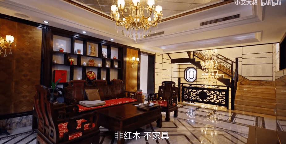 据豪宅经纪人的说法,当初业主买入这套房子花了6000万元,然后装修花了7000多万元。其室内装修极尽奢华,除了全屋200吨的纯红木定制家具外,房子里各种珍稀藏品也价值不菲——入户玄关是绣娘花了3年时间绣制的精美双面苏绣屏风;挑高7米的客厅内有七彩琉璃玄关屏风,2吨重的金镶玉吊灯以及金丝楠木雕刻的背景墙;偏厅内陈列着四副清代的瓷板画等等。