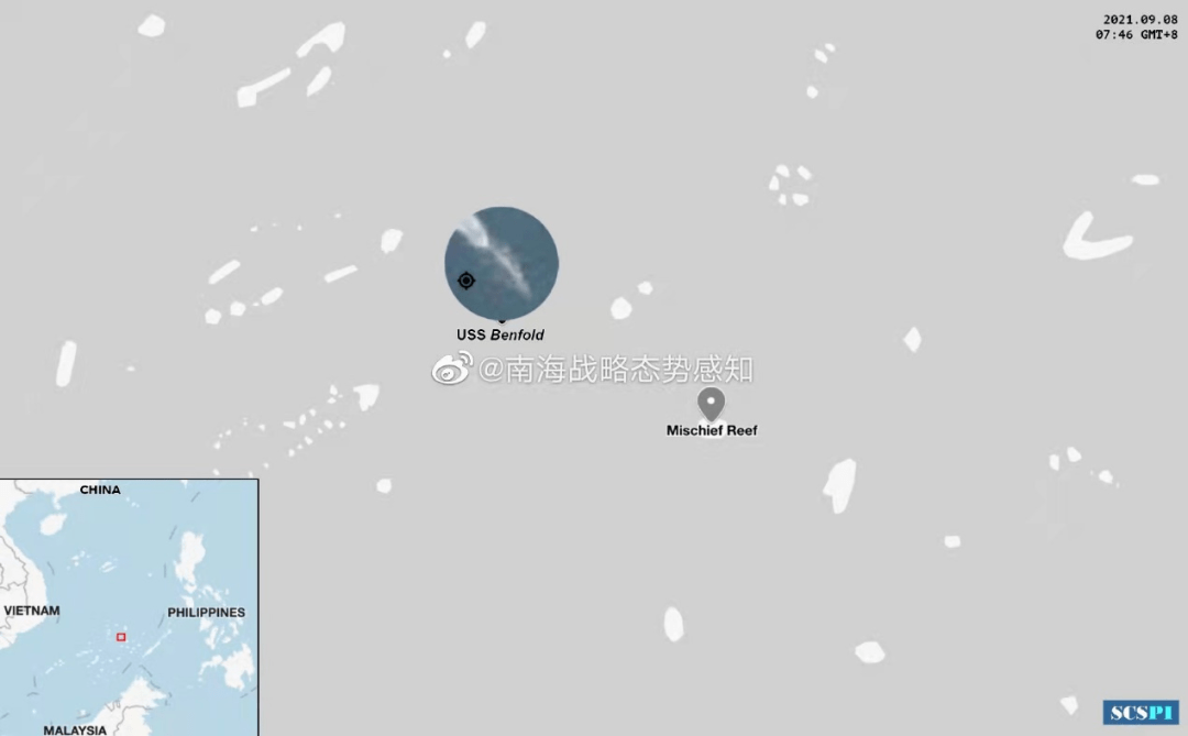 图为南海态势感知平台发布的美舰闯美济礁的卫星图。 从南部战区发言人田军里8日有关“美方行径严重侵犯中国主权和安全,是其大搞航行霸权、制造南海军事化的又一铁证”“美是不折不扣的南海安全风险制造者,是南海和平稳定的最大破坏者”的表述,老刘并没有找到与之前美舰闯南海时战区发言人表述非常大的不同。 不过,老刘在查阅第七舰队8日在其官网上发布的有关本次闯入美济礁周边海域行动的声明中,看到了一些不太寻常的措辞与表述。