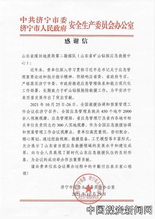 【本网讯】近日,山东省煤田地质局第二勘探队收到济宁市安全生产委员会发来的感谢信,信中对该队认真落实济宁市应急管理工作部署,开展矿山钻探应急救援,为济宁应急管理工作作出的突出贡献表示衷心感谢。