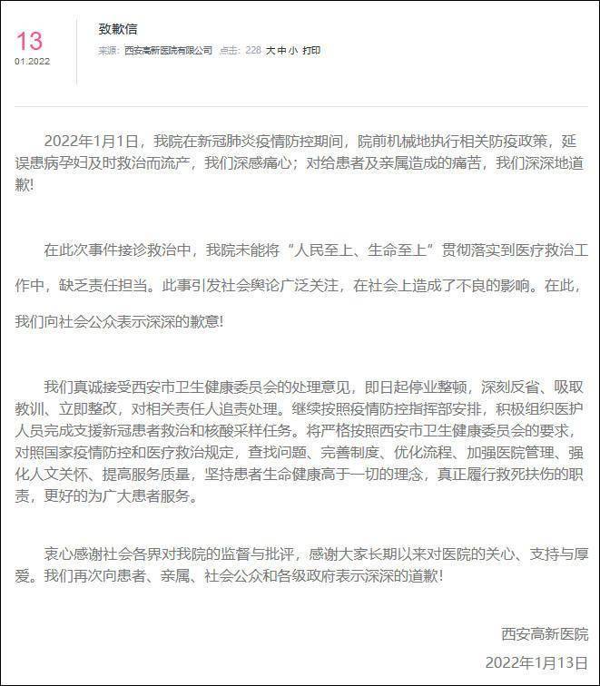 1月13日,西安高新医院官网发布致歉信:2022年1月1日,我院在新冠肺炎疫情防控期间,院前机械地执行相关防疫政策,延误患病孕妇及时救治而流产,我们深感痛心;对给患者及亲属造成的痛苦,我们深深地道歉!