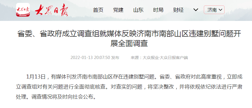 1月13日,有媒体刊发济南市南部山区存在违建别墅问题。省委、省政府对此高度重视,立即成立调查组对有关问题进行全面彻底核查。对查实的问题,将坚决整改,并将依规依纪依法进行严肃处理。调查情况将及时向社会公布。