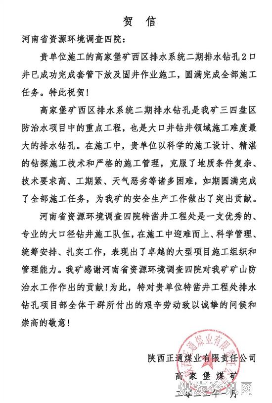 【本网讯】新年伊始,一封贺信拉近了河南局资环四院与陕西正通煤业有限公司高家堡煤矿的距离,由资环四院施工的《高家堡矿西区排水系统两个排水钻孔工程》按照工期提前两个月圆满完成套管下放及固井作业施工,为矿区安全生产提供强有力支撑。为此,陕西正通煤业有限公司高家堡煤矿特发来贺信,庆贺这份丰收的喜悦,充分肯定资环四院为矿区作出的工作成绩。