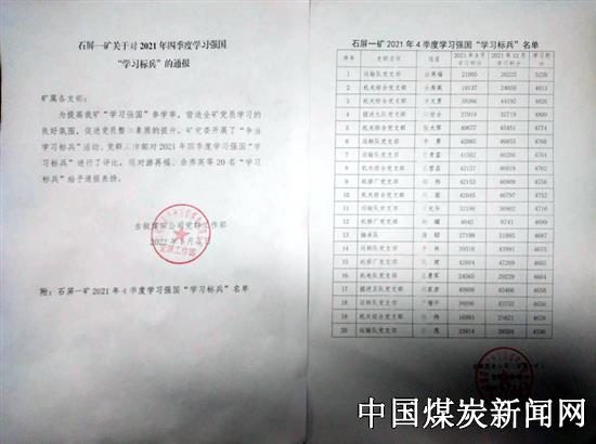 【本网讯】为激励学习先进,增强党员学习积极性,营造良好的学习氛围,提升党员的政治觉悟和思想意识。2022年1月5日,古叙煤田公司石屏一矿党群工作部开展了四季度学习强国“学习标兵”评比,对游再福、佘秀英等20名党员给予通报表扬。