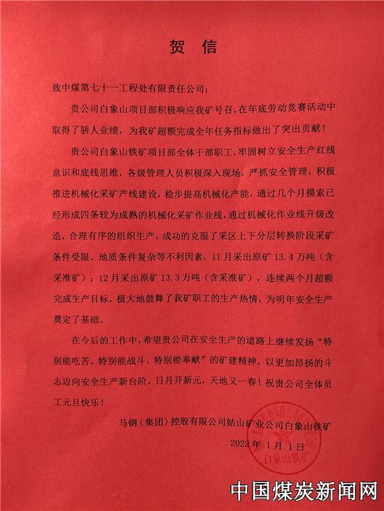 【本网讯】2021年年末,中煤七十一处白象山项目部连续两个月超额完成生产目标,喜获甲方贺信。
