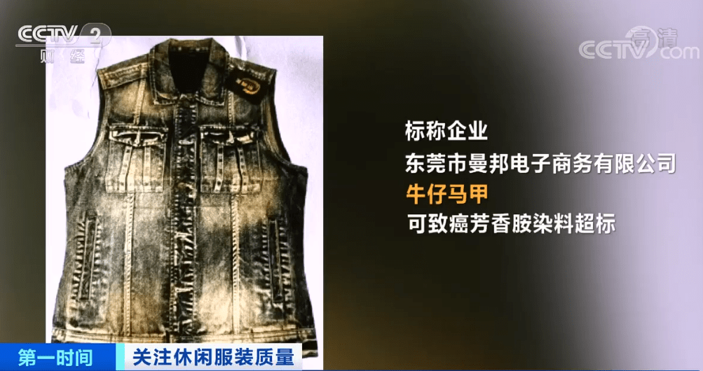 除上述企业外,一家标称为东莞市曼邦电子商务有限公司生产的牛仔马甲,也检出可致癌芳香胺染料含量也超过了标准数值,达到了30毫克每千克。