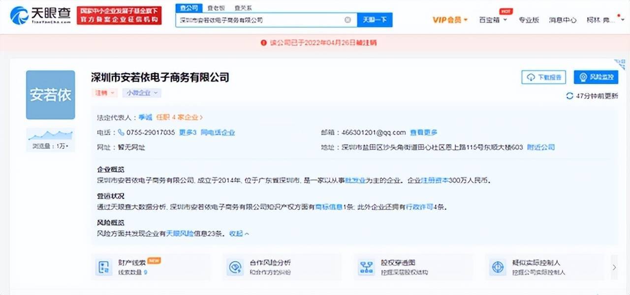 专家认为,有些企业为了降低成本,就没有特别注重环保的要求。 据悉,在本次网售休闲服装产品监督抽查结果中,共发现246批次产品合格,占比超八成。其余58批次产品不合格,不合格率为19.2%。主要不合格项目为纤维含量、色牢度、pH值,以及可分解致癌芳香胺染料等方面。 针对本次休闲服装抽查结果,检测机构已经向不合格企业发出了产品质量改进建议书。市场监管总局表示将继续开展对休闲服装产品的质量监督,有效跟踪不合格企业,督促企业纠正错误,保护消费者权益。 据北晚在线消息,天眼查APP显示,上述涉事公司深圳市安若依电子商务有限公司成立于2014年, 是一家以从事批发业为主的企业,曾因登记的住所或经营场所无法联系而被列入企业经营异常名录,该公司已于2022年04月26日被注销。